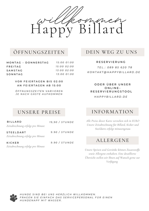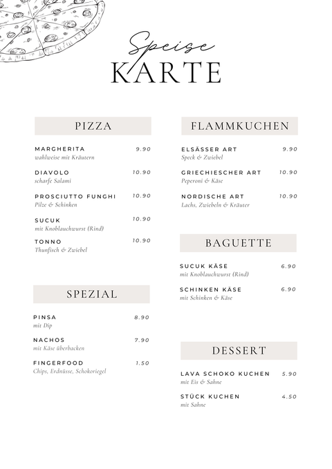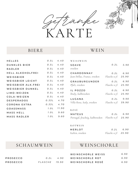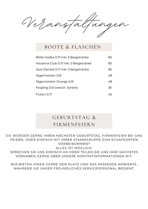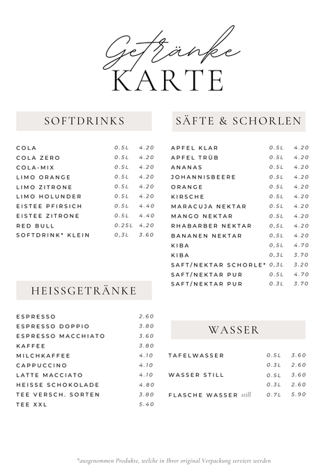 Wir bieten ein großes Sortiment an erfrischenden, alkoholfreien Getränken und genussvollen Sprirituosen. Für den kleinen Hunger gibt es außerdem belegte Sandwiches und warme Pizzen.